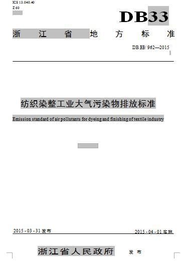 浙江省環(huán)保廳于2015年4月印發(fā)浙江省地方標準《紡織染整工業(yè)大氣污染物排放標準》。標準對紡織染整行業(yè)大氣污染物排放特別是VOCs排放做了具體的規(guī)定。全文如下: