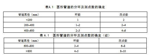 將煙道分成適當(dāng)數(shù)量的等面積同心環(huán),各測點選在各環(huán)等面積中心與呈垂直相交的兩條直徑線的交點上,其中一條直徑線應(yīng)在預(yù)期濃度變化最大平面內(nèi),所分等面積園環(huán)數(shù)由管道直徑大小而定并按下表A.1確定環(huán)數(shù)和測點數(shù)。