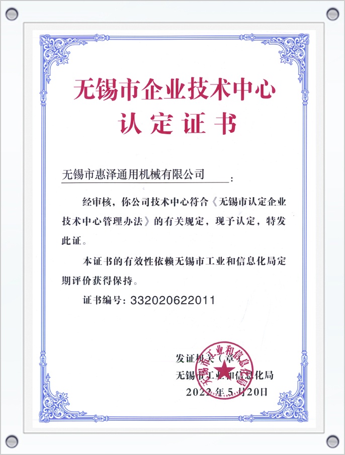 無錫市企業(yè)技術(shù)中心認(rèn)定證書